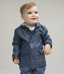 100% polyester. Striped cotton lining. Showerproof. Full length zip with chin guard and studded storm flap. Two front stud closure patch pockets. Open cuffs and hem. Unbranded size label at neckline.