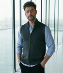 50% cotton/50% acrylic. Semi fashioned neckline.Ribbed collar, armholes and hem.Full length metal zip with brass metal zip pull.Covered placket.Two front welt pockets.Cut out label.