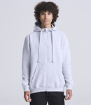 70% ringspun cotton/30% polyester.* Soft cotton faced fabric. Brushed back fleece. Drop shoulder style. Three panel, single jersey lined hood with flat lace drawcord. Full length plastic zip with chin guard. Front pouch pockets with flatlock stitching. Ribbed cuffs and hem. Tear out label.